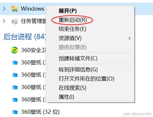 步骤1:按下【Ctrl+Shift+Esc】打开【任务管理器】 ,找到【Windows资源管理器】 进程,右键选择【重新启动】 ;