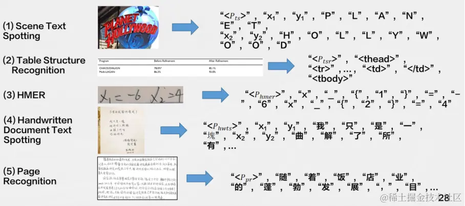 其次是无需OCR的用于文档理解的Transformer模型,基于SPTS的OCR大一统模型(SPTS v3)将多种OCR任务定义为序列预测的形式。通过使用不同的prompt引导模型完成不同的OCR任务,可以极大地提高模型的泛化能力。例如,可以使用“where is the date on this document?”来询问文档中的日期位置,或者使用“what is the text on this image?”来识别图像中的文本。另外,SPTS v3沿用了SPTS的CNN + Transformer Encoder + Transformer Decoder的图片到序列的结构,这使得它可以更加高效地处理各种不同的OCR任务。
