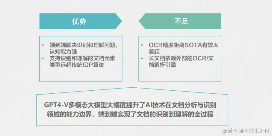 对以上问题进行分析可以看到GPT4-V的核心特点就是端到端的把文档领域的感知和认知问题解决了。传统方法是先做感知,再做认知,先做文档分析,再做NOP的理解。GPT4-V借助大规模语言模型在理解和认知的能力上非常强,它支持识别和理解文档元素,比如除了传统的文字表格、公式之外对流程图以及图表的识别能力也远远超过传统方法。当然GPT4-V也有不足的地方,比如它目前的精度距离SOTA还是有很大的差距。总体来说GPT4-V这种多模态的大模型其实就是提升了AI技术在IDP领域的能力边界,很多之前处理不好的问题,可以通过GPT4-V进行解决。编辑