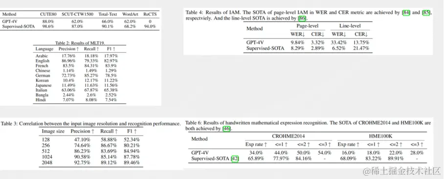 虽然GPT4-V的能力非常惊艳,但GPT4-V依然不能把OCR领域的所有问题都解决。经过详细的分析发现,GPT4-V也存在着很多问题,比如中文,大家在用的时候会发现中文不管是手写体还是印刷体,GPT4-V识别出来会产生严重的幻觉,经常会输出一大段不存在的文字,并且对于手写公式的识别效果也不是特别好。为了更直观的看出GPT4-V在OCR和IDP领域的效果怎么样,金老师的团队发表了一篇文章量化的评估了一下GPT4-V和SOTA在OCR领域的对比。通过对比发现除了在手写英文识别接近之外,其他的场景如文字书别、多语言识别、手写公式识别等GPT4-V和SOTA的差距都非常大。编辑