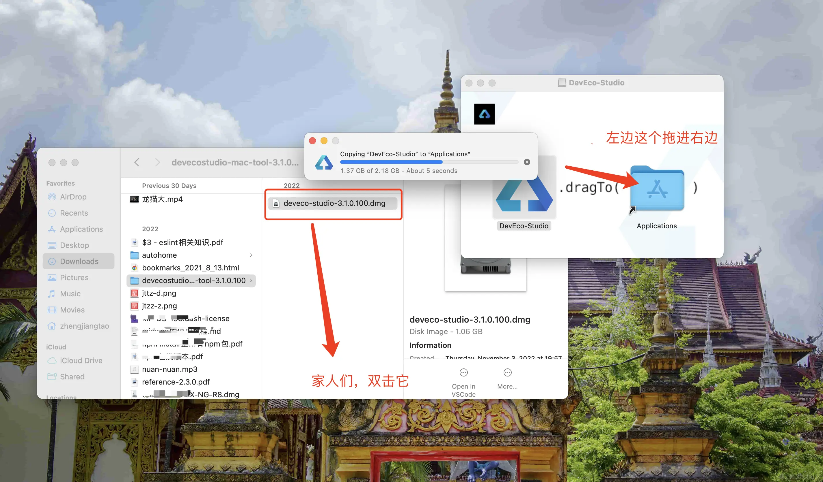 接着我们双击解压对应的压缩包,然后双击dmg文件,按照图片的提示,把左边的软件拖到文件夹中。