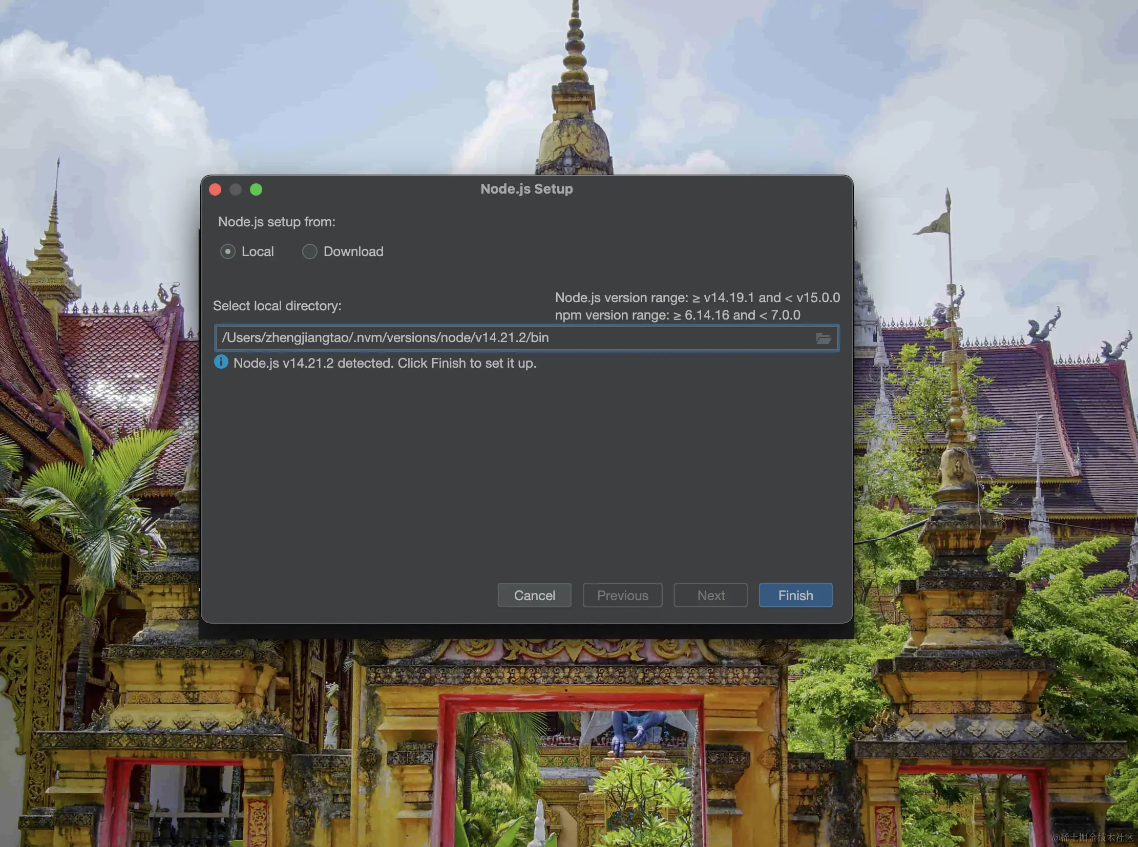 因为我之前装了nvm,所以我这里选择本地,这里你可以关注下红色那句话,对node是有版本要求的,不能太高,也不能太低哦。