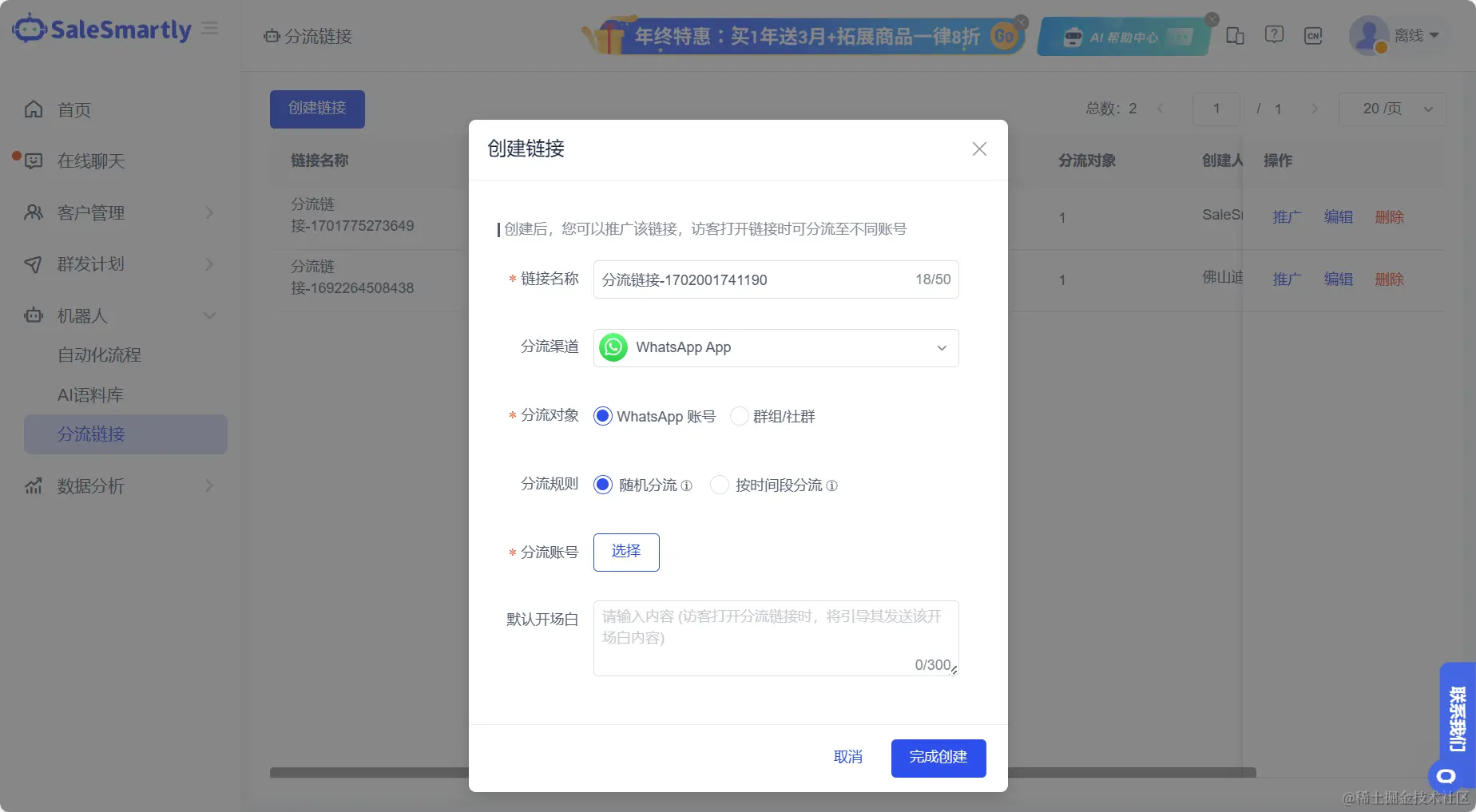 在【机器人】-【分流链接】,点击【创建链接】。分流渠道中选择WhatsApp App,然后选中WhatsApp账号,点击【完成创建】即可,后续客户也可以根据这条链接来追踪数据。