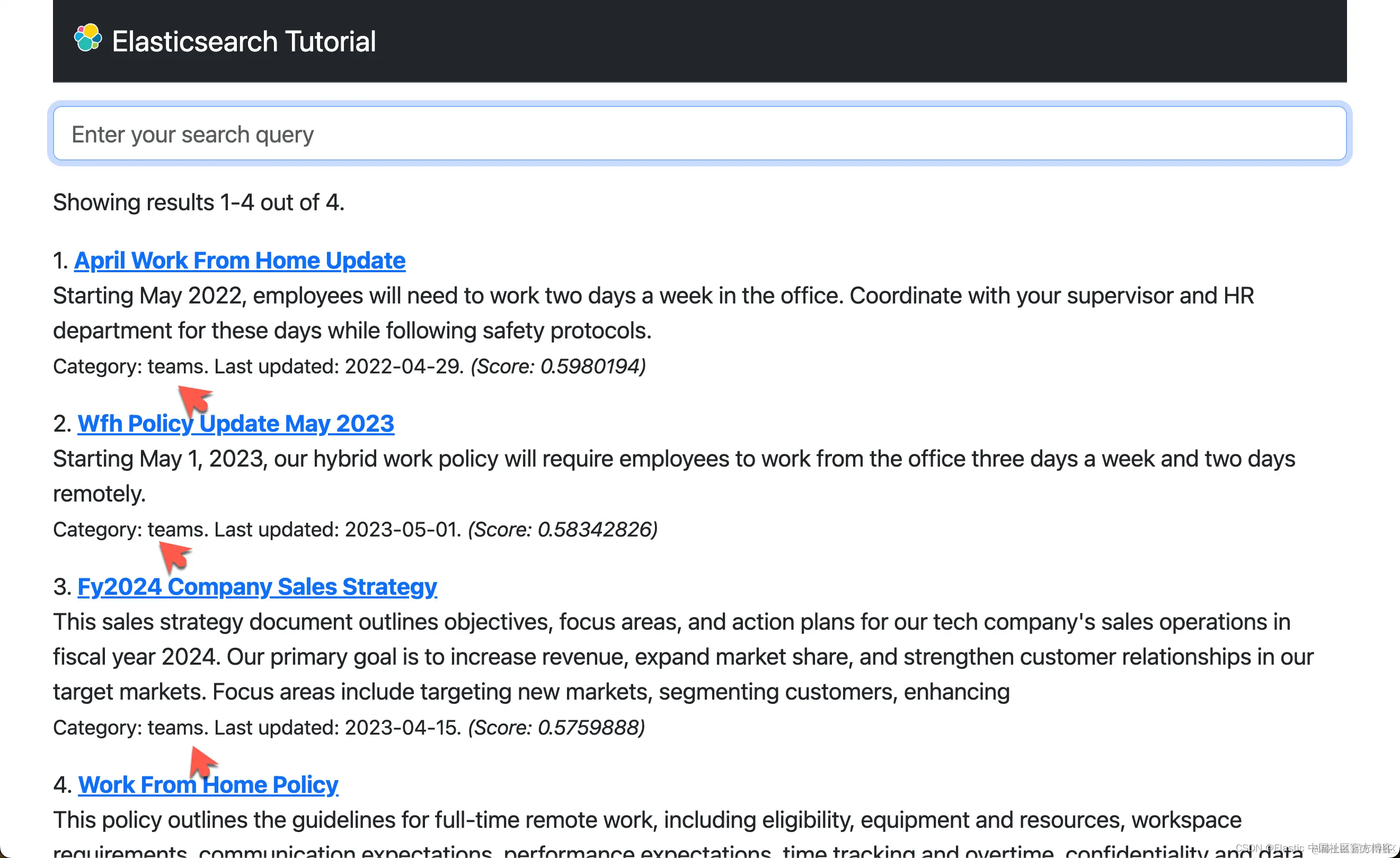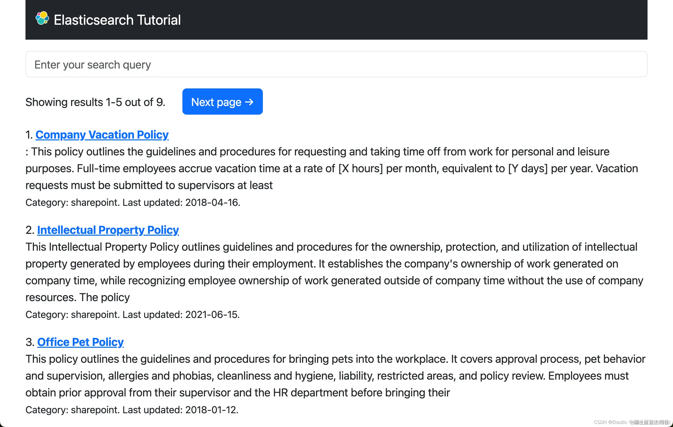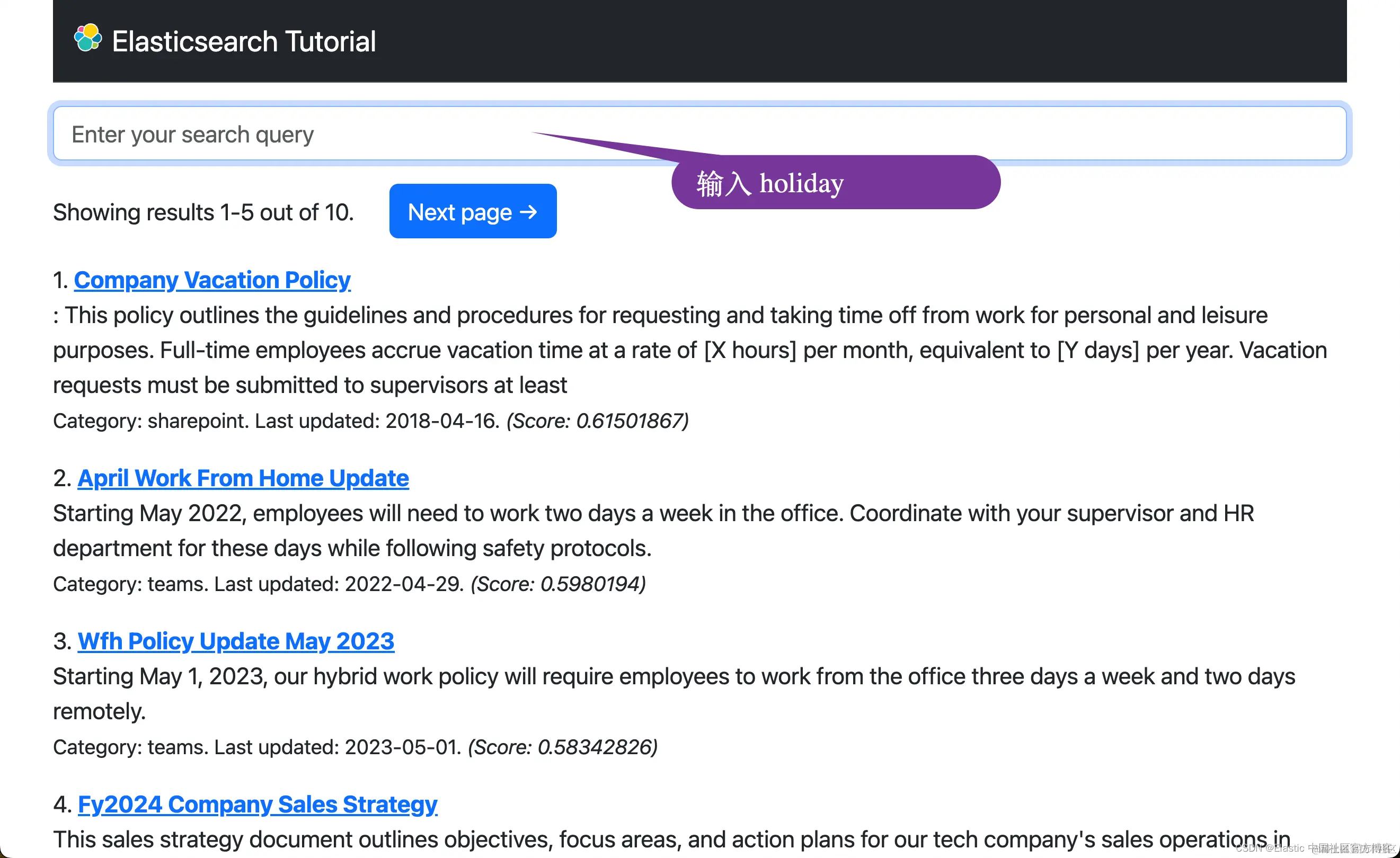 - 搜索 “holiday”(英式英语,相当于美式英语中的 “vacation”)时,kNN 搜索会返回文档 “Vacation Policy” 作为顶部结果,即使单词 “holiday” 本身没有出现在文档中。