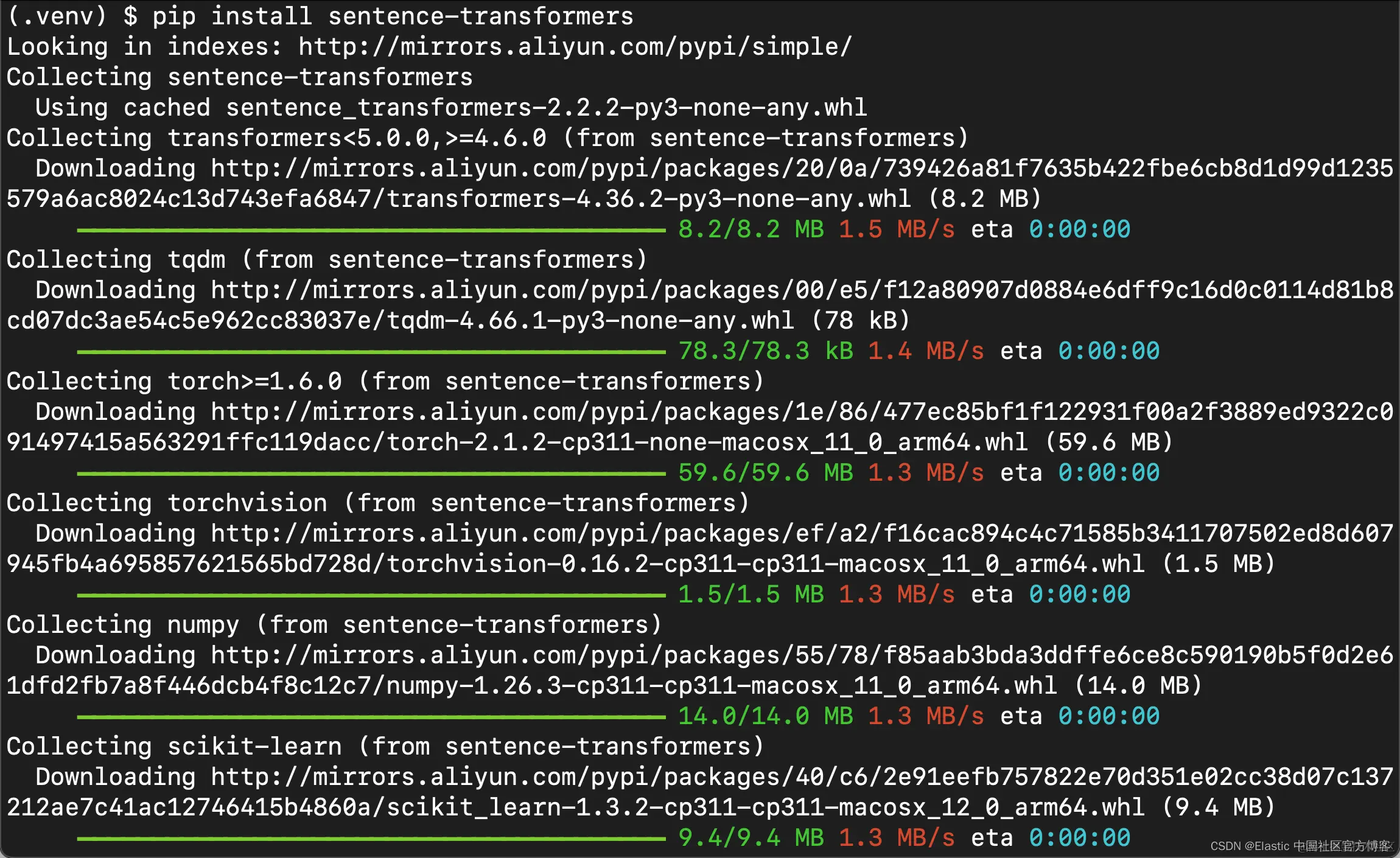 SentenceTransformers 框架作为 Python 包安装。 确保你的 Python 虚拟环境已激活,然后在终端上运行以下命令来安装此框架: