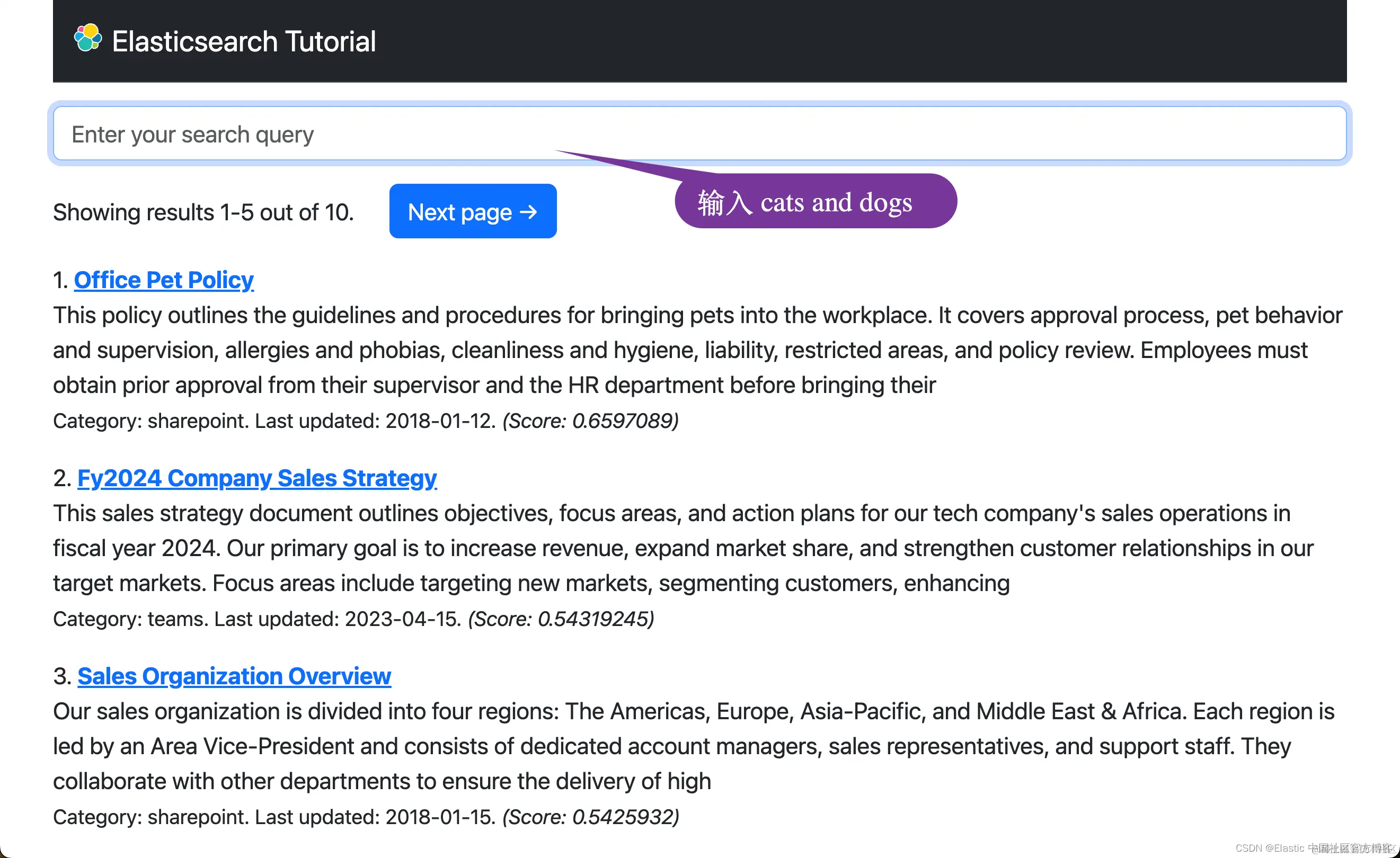 - 搜索 “cats and dogs" 或任何其他与宠物相关的术语会将 “Office Pet Policy” 文档作为顶部结果,即使文档摘要未提及任何特定宠物。