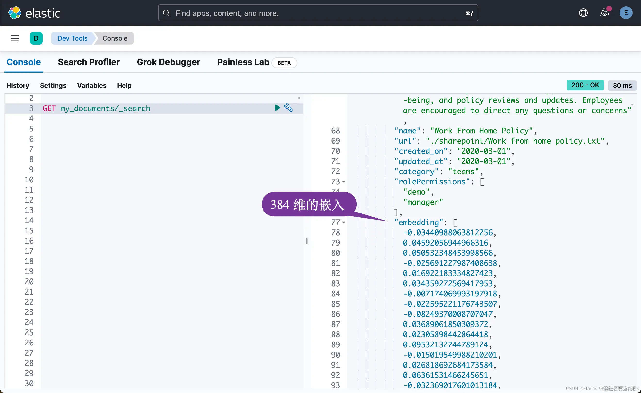 正如你所看到的,embedding 字段被赋予了 dense_vector 类型,这是存储嵌入时的适当类型。 稍后你将了解另一种类型的向量,即 sparce_vector,它在其他类型的语义搜索应用程序中很有用。