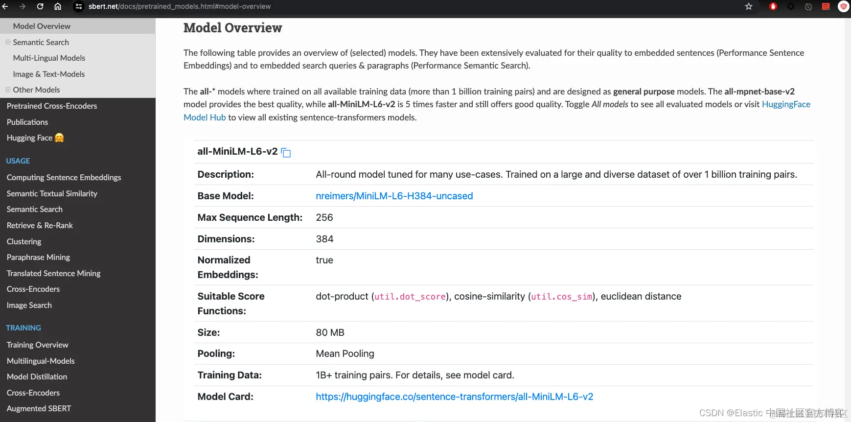这似乎表明他们的全 MiniLM-L6-v2 模型是一个不错的选择,在速度和质量之间提供了良好的折衷,所以让我们使用这个模型。 在表中找到该模型,然后单击 “info” 图标以查看有关它的一些信息。