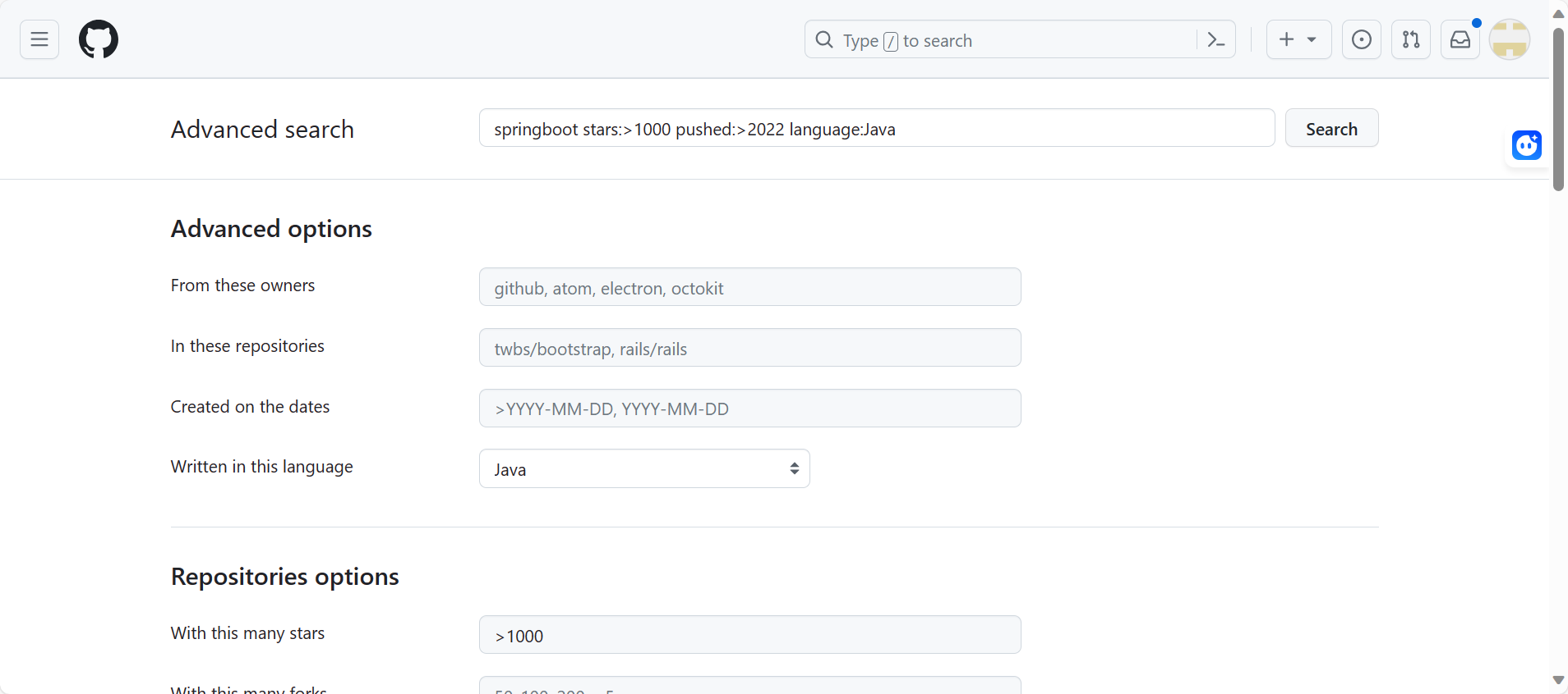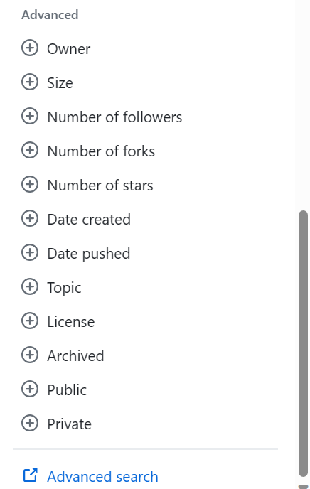 github提供了高级搜索,通过输入特定的这个条件表达式,我们可以实现更高精度的过滤,从而找到真正符合自己预期的项目。没有必要去背这些条件,以及这些表达式; 高级搜索这里有一个可视化的界面,直接使用即可。