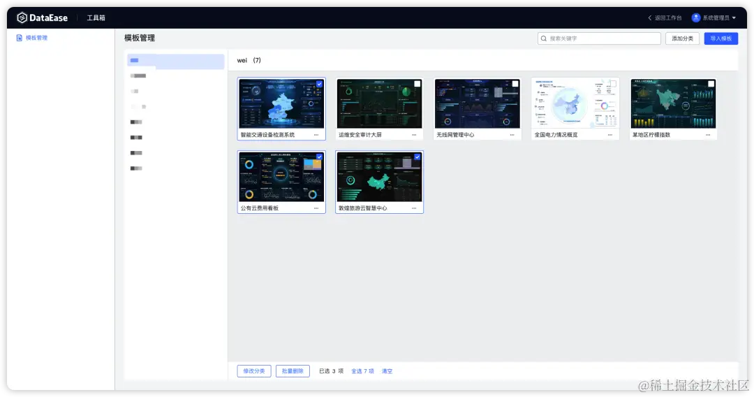DataEase v2.2.0版本的“模板管理”功能模块,支持用户对模板进行批量删除、修复分类等操作。