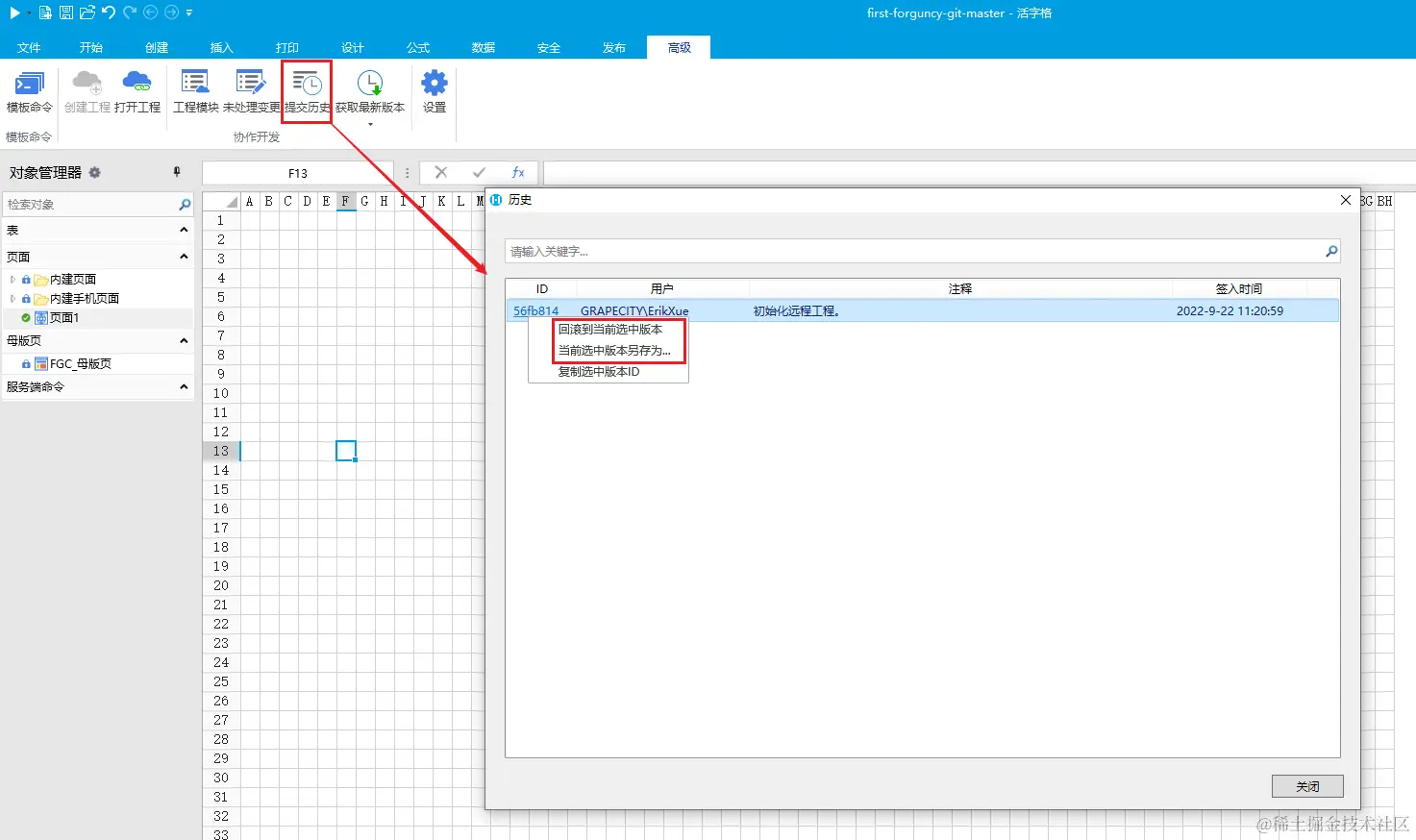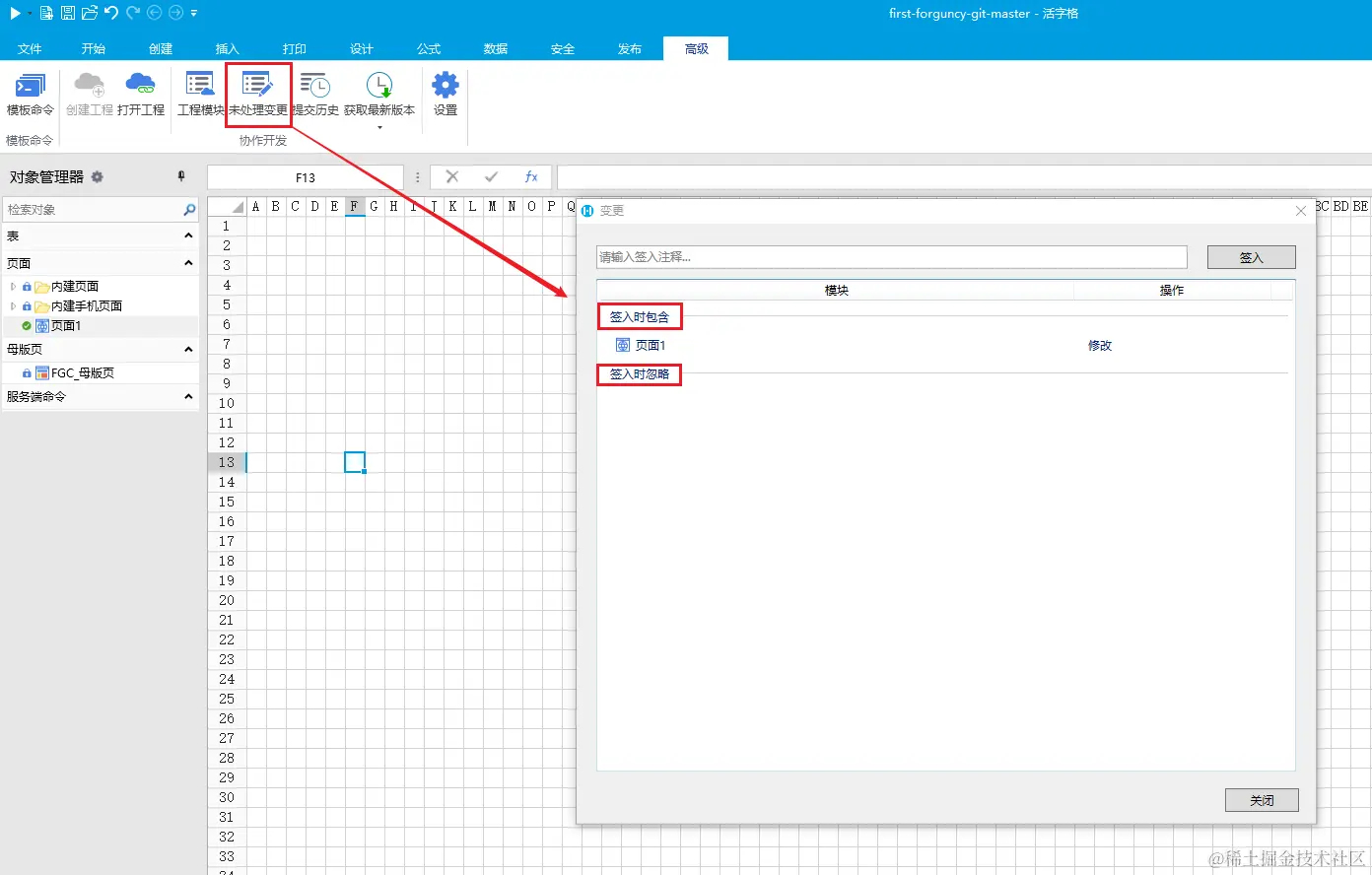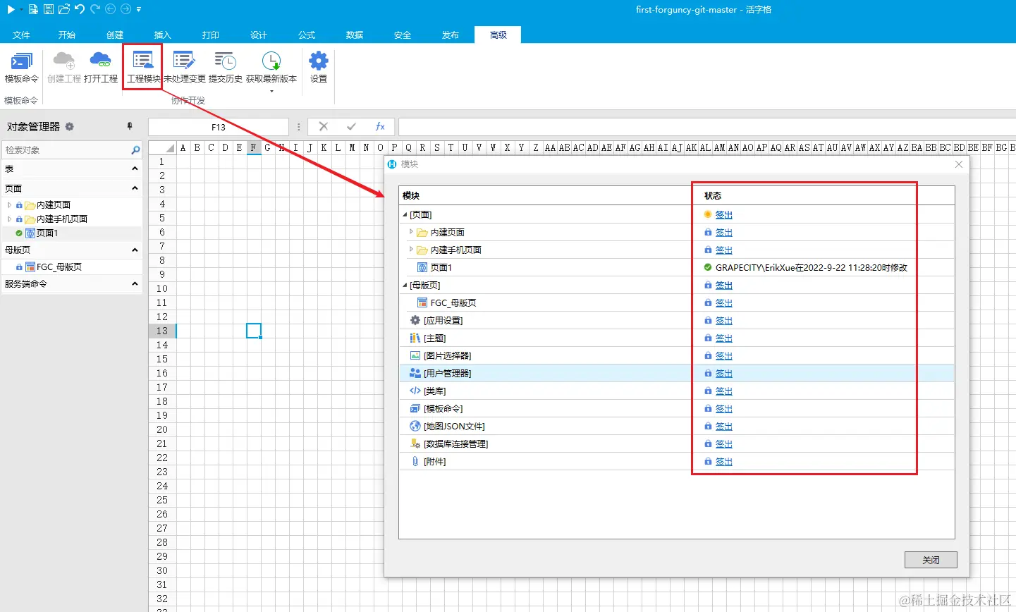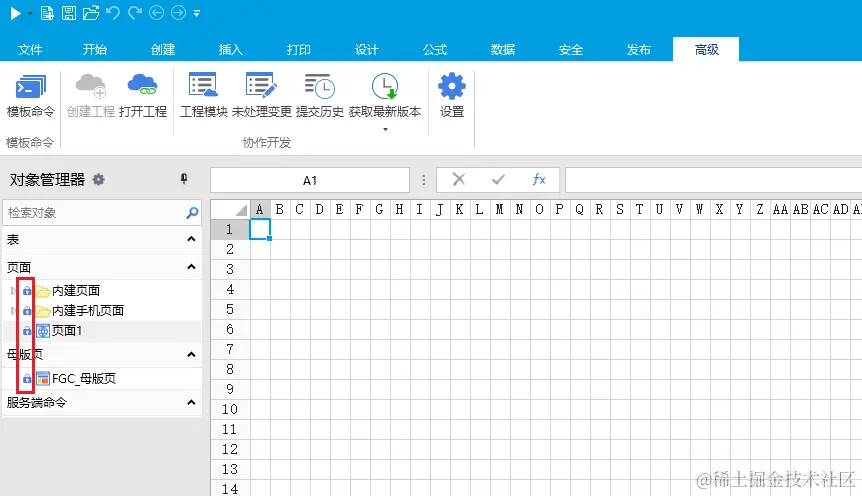 创建为协同工程后,左侧的对象管理器中,可以看到每个独立的页面、母版页等都带有一个小锁的标志。