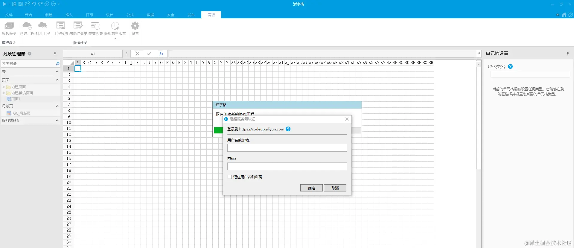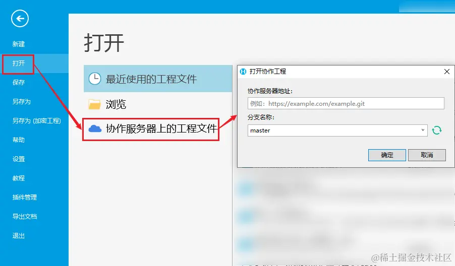 在“协作服务器地址”中输入协同网站中对应仓库的地址,然后点击“确定”,此时会先进行身份验证,输入对应协同网站的用户名或邮箱及密码后,验证通过,会将当前工程推送至对应仓库中,此时该工程已成功创建为协同工程。