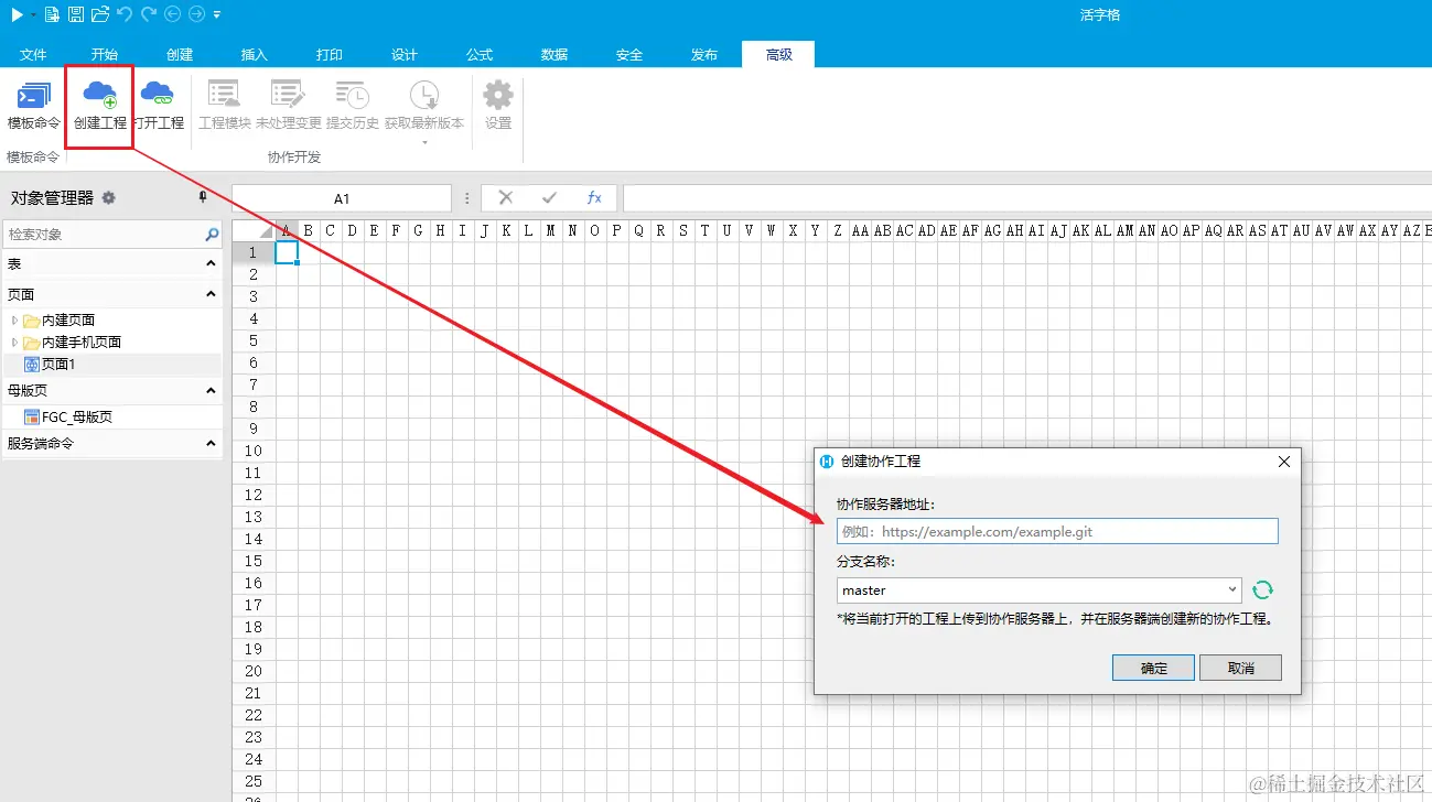 打开设计器,在上方菜单栏中选择“高级”,创建工程: