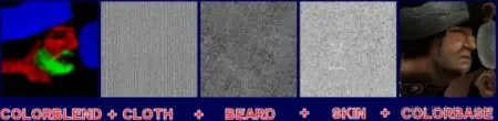 细节纹理还有另一个用途,它需要一些编程来为游戏引擎创建像素着色器。使用着色器,您可以在模型上同时使用最多三个不同的细节纹理,使用顶点颜色或额外的纹理来定义混合。您可以使用图片中的 RGB 颜色值来定义混合,并且每个颜色值都与您在游戏材质系统中定义的一个细节纹理一致。这允许从一个细节纹理平滑混合到另一个细节纹理,因为它检查了 RGB 级别。(当然,黑色根本不会出现。下图显示了将细节纹理与颜色映射表结合使用时的颜色示例和最终结果。