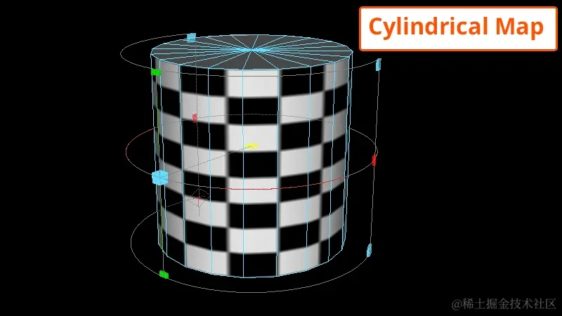 圆柱映射基于圆柱投影形状为 3D 对象创建 UV。这对于可以完全封闭且在圆柱体内可见的物体非常有用。所以像胳膊或腿一样的东西。