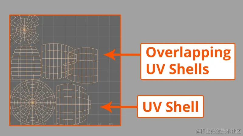 通常,在处理这些 shell 时,其中一些 shell 可能会在 UV 编辑器中重叠。如果发生这种情况,纹理将重复出现。除非有特殊需要,就像游戏纹理有时一样,否则通常应避免重叠的UV外壳。
