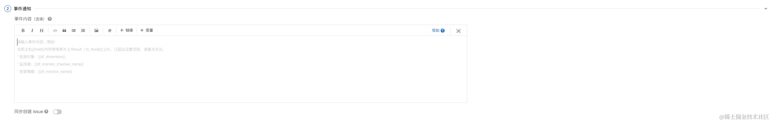 - 智能监控会在发现异常后由算法自动生成事件报告并通知相关人员,帮助您及时发现异常情况并快速定位分析。您还可以自定义配置事件通知使接受人更清楚的了解事件内容;或将同步创建 Issue 异常追踪进行高效地统一管理。