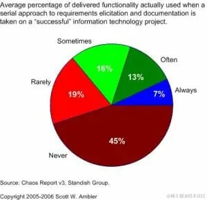 1. 浪费。 一个产品中只有很少的功能是被真正需要的,把所有的东西都设定为需求,我们就忽视了优先级,忽视了去实现客户真正需要的、能解决他们的问题的东西,这就为功能的蔓延埋下了隐患。这种功能蔓延是对精力和资源的巨大浪费。早在2006年,Standish Group的报告就显示,即使在成功交付的项目中,也有45%的功能从未被使用过!