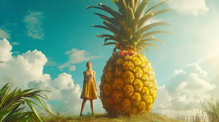 一名女孩站在一个巨大的菠萝前,以32K UHD风格呈现,杰西·阿姆斯·博特克,乡村生活场景,实验性视频