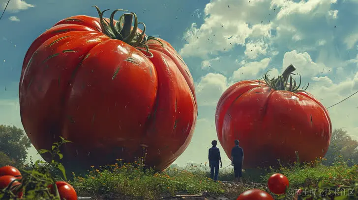 一个男子站在一个巨大的番茄前,以普罗维亚胶片风格呈现,宏伟的尺度,巨大的规模,32K UHD,大胆的色彩主义,环保的工艺,法国乡村