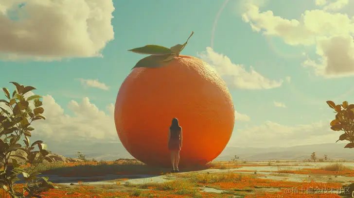 一名女孩站在一个巨大的橙子前,以32K UHD风格呈现,杰西·阿姆斯·博特克,户外场景,视频反馈循环,技艺娴熟
