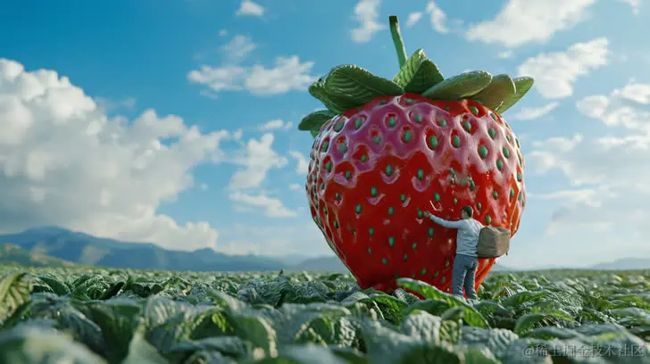 一个男子将一个大大的红色草莓带入田野,以超现实的逼真风格呈现,巨大的规模,逼真的生动人物,32K UHD,逼真,中国朋克