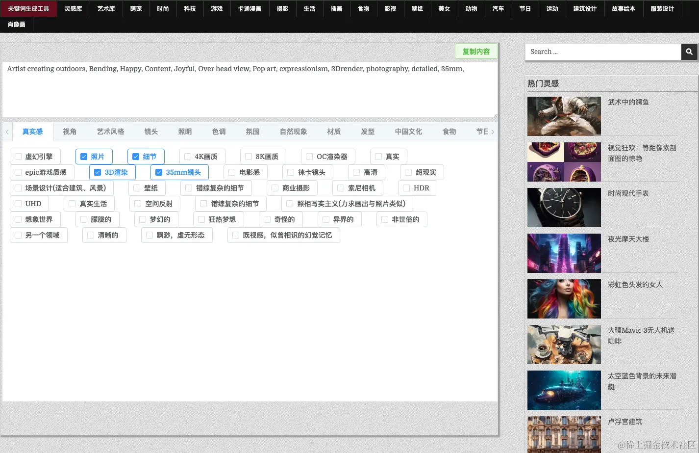 词图库的关键词生成工具,涵盖30+种类,100000+关键词(还在持续增加中),如真实感,艺术风格,照明,氛围,中国文化,人物表情,人物姿态,童话场景,生活场景,交通工具,建筑,人物面部特点等等,可以快速添加关键词形成你的无限创意,能极大地提高你的工作效率。