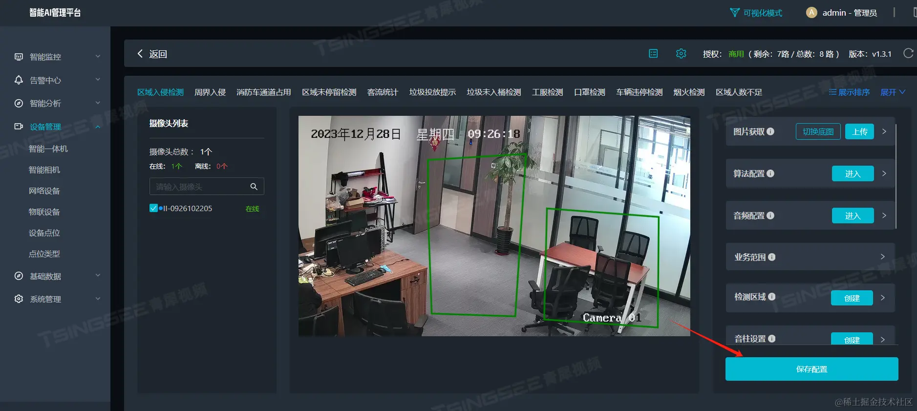 5)上图所示是配置好的绘画区域,也可以自定义绘制(点击【检测区域】进行绘制即可),如果不绘制则默认检测整个摄像机的画面,点击保存配置可以将算法保存。