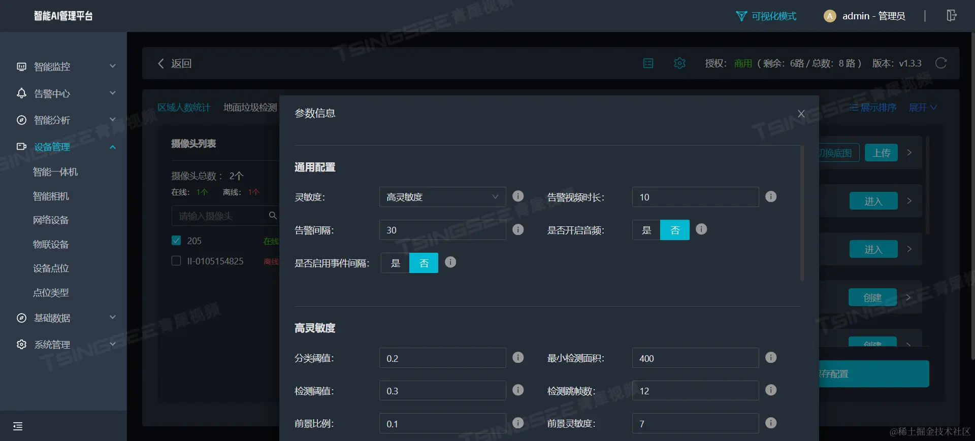 此外,用户也可以在右侧各项设置参数中修改和配置具体的参数,如算法灵敏度、告警视频时长、告警间隔、是否开启音频、音柱设置、算法生效时间段、是否检测人头一体等。