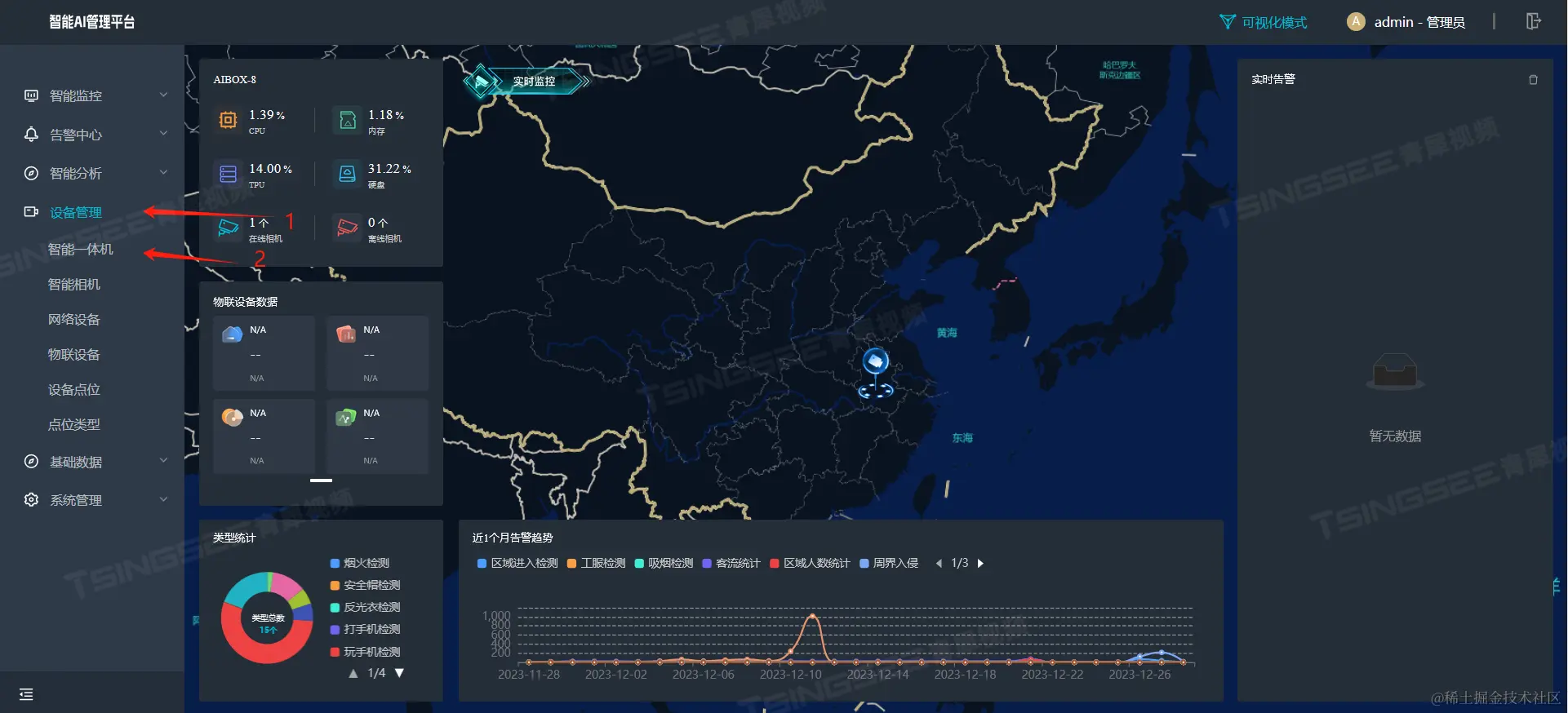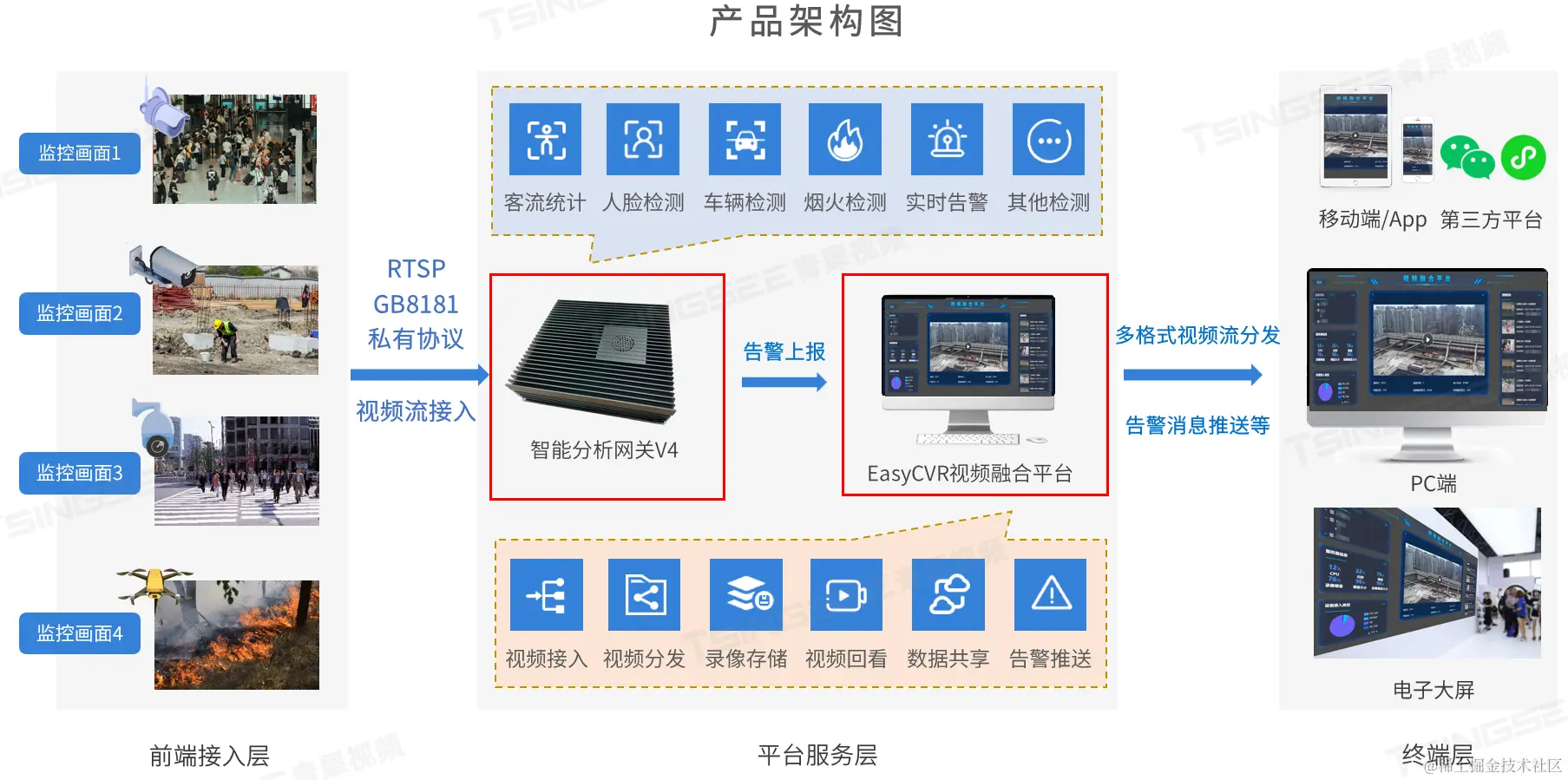 边缘计算AI智能分析网关(V4版)部署了近40种AI算法模型,支持对接入的视频图像进行人、车、物、行为等实时检测分析,并上报识别结果,并能进行语音告警播放。算法配置后,即可对监控视频流进行实时检测,包括安全帽/工作服检测、人员摔倒、玩手机/打电话检测、区域人数统计、烟火检测等。当检测到事件后,将立即触发告警并抓拍,并上报告警消息。告警消息可通过弹窗、提示音等方式进行提醒,便于管理人员及时查看。