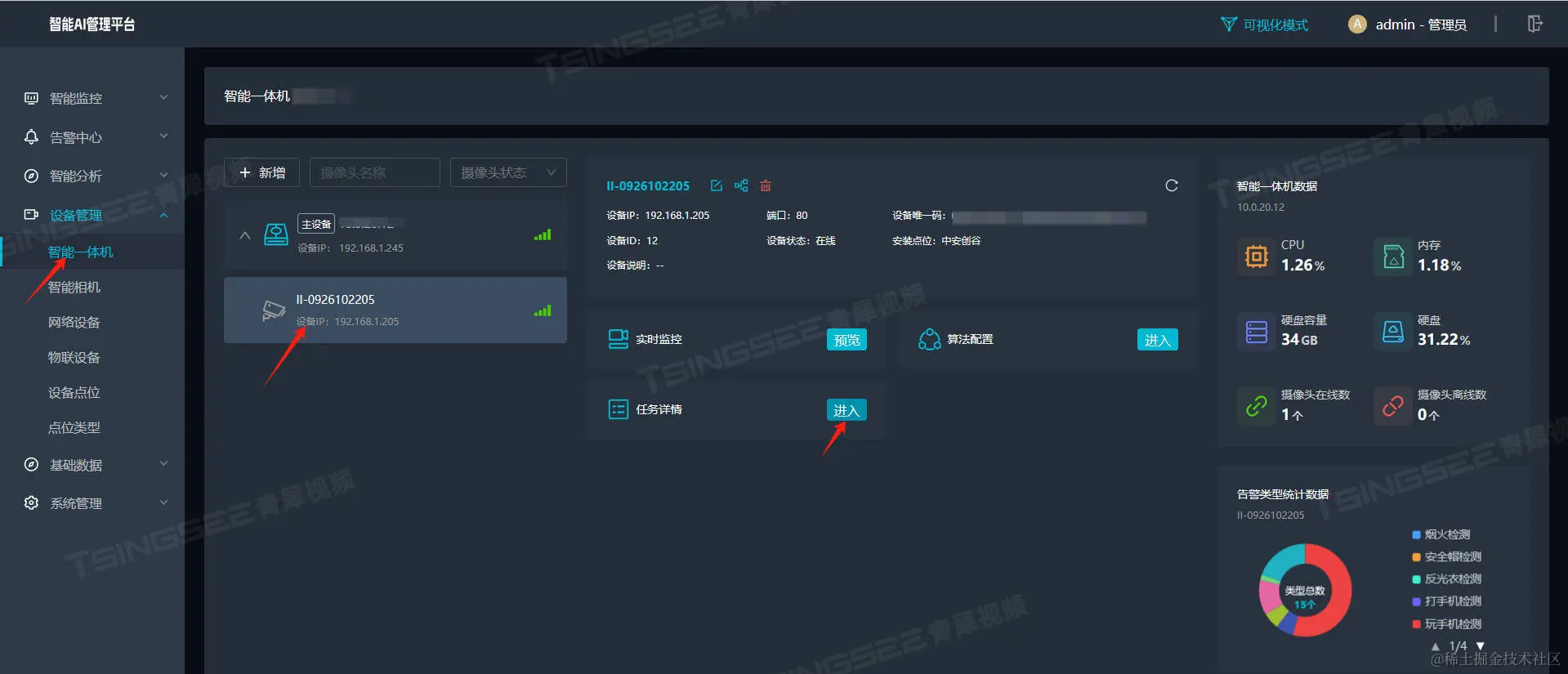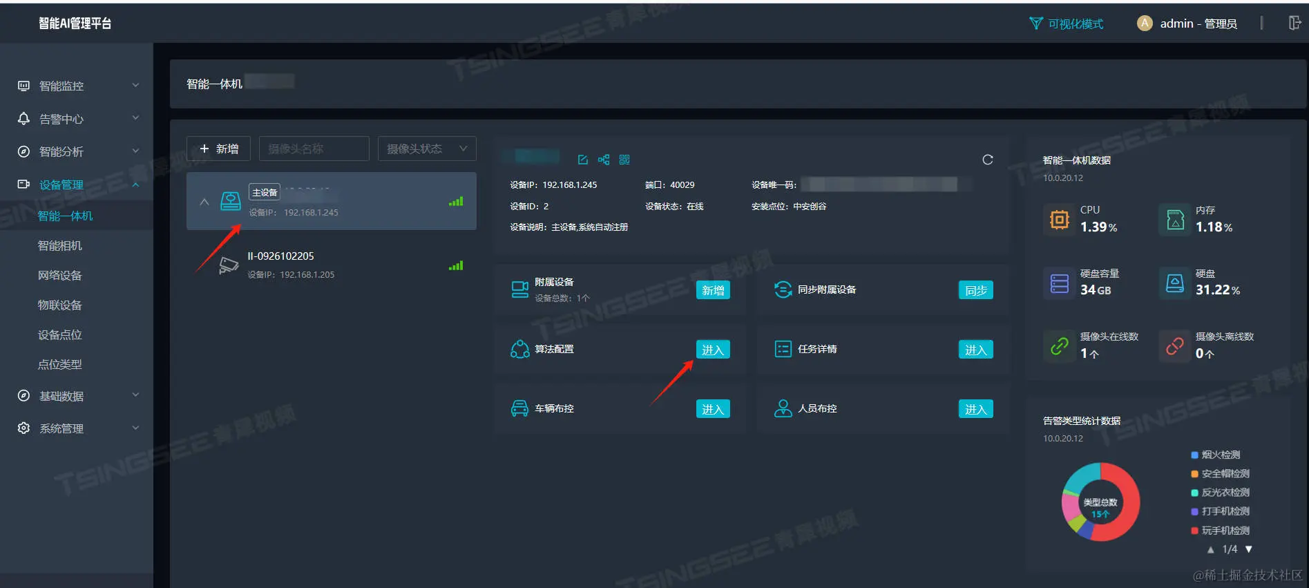 3)选择一体机设备,找到【算法配置】,点击【进入】;