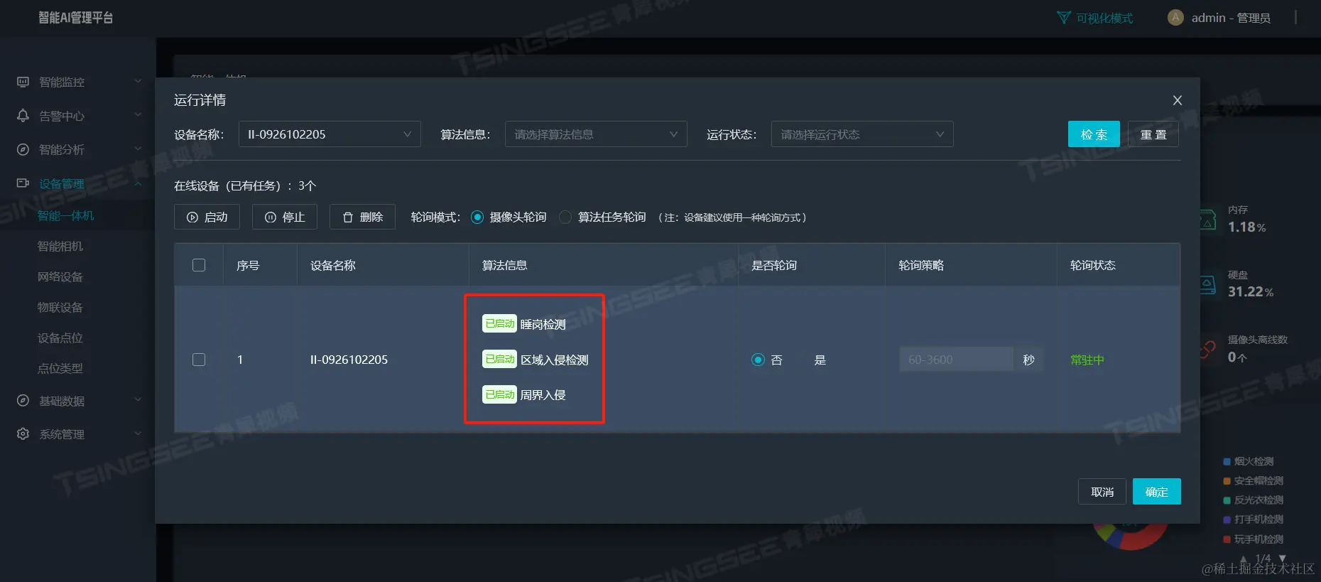 6)保存完毕后,可以选择该摄像机查看正在生效的算法;