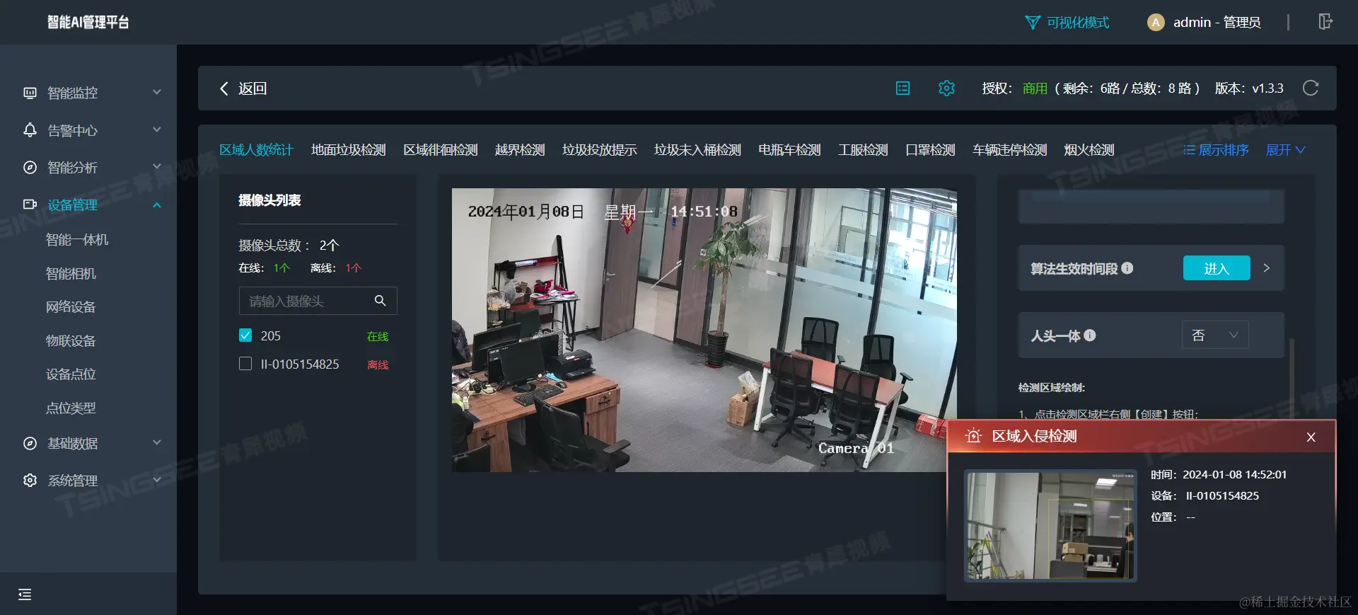 4)在算法栏中选择【区域入侵检测】算法,选择需要配置该算法的摄像机,这个时候会出现预览画面;