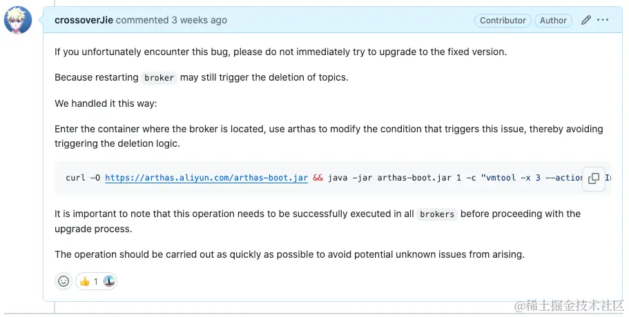 最终我们想到一个办法,使用 arthas 去关闭了一个 broker 的一个选项,之后就不会执行出现 bug 的那段代码了。