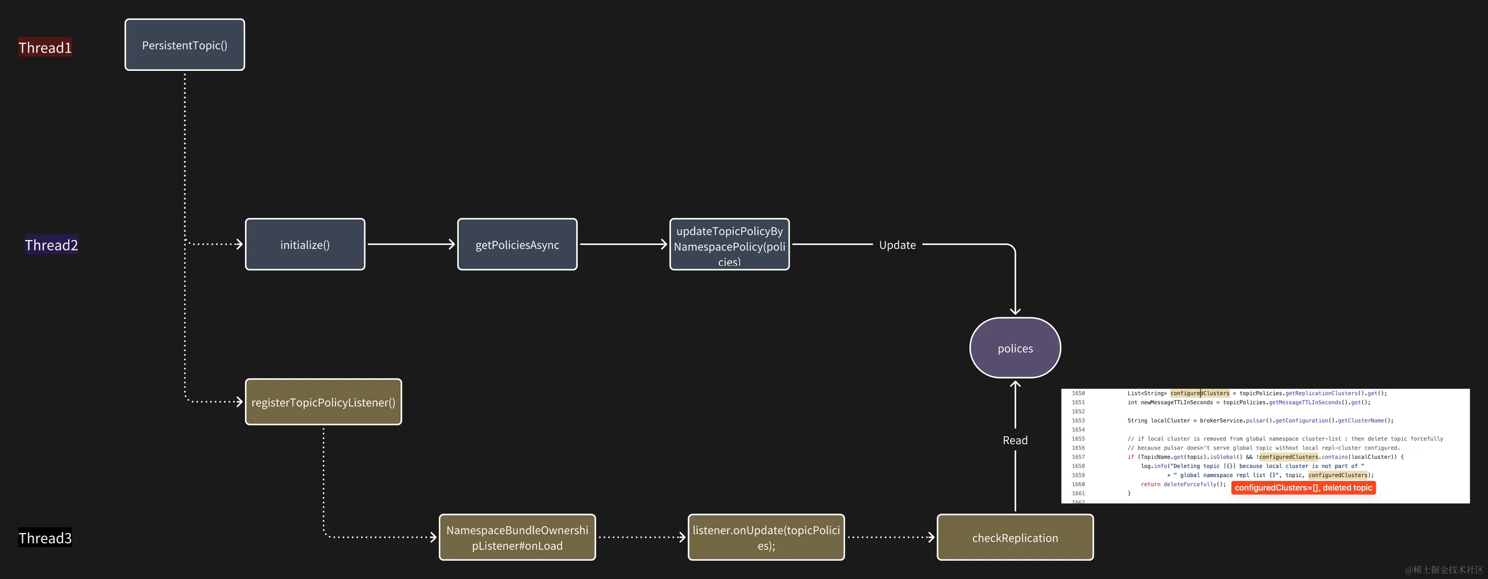 在 thread3 读取 topicPolicy 进行判断时,thread2 可能还没有把数据准备好,所以就导致了 topic 被删除。