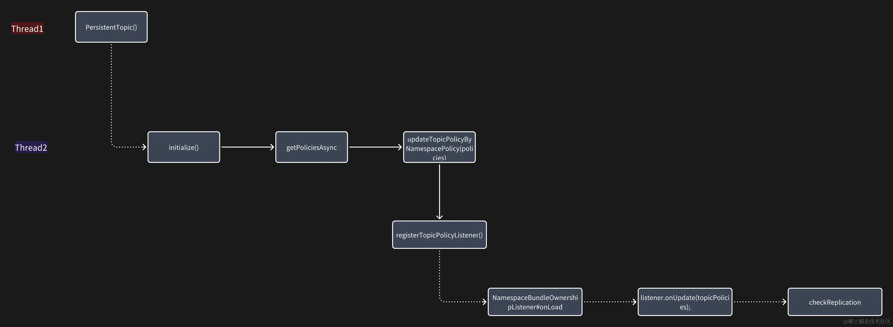 这里画了一个流程图就比较清晰了,在 broker 重启的时候会有两个线程同时topicPolicy 进行操作。