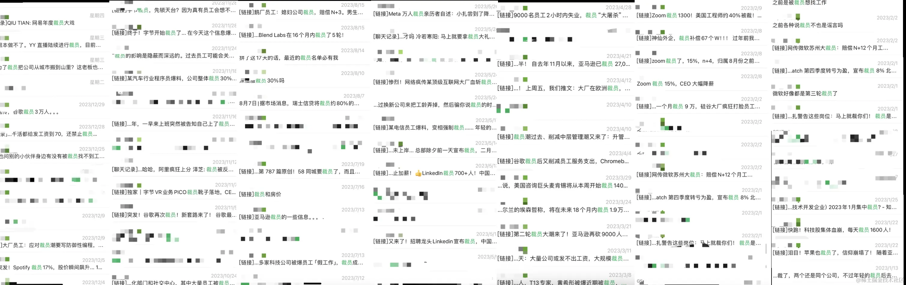 从 2023 年初的时候就开始一直听到各种裁员消息,2023 开年就是在微软中国、Zoom、谷歌中国,亚马逊,Linkin 等外企大规模裁员的消息开始,之后持续至年末,大厂裁员的消息一直没停过,似乎这就是我印象中最贯穿 2023 的关键词。