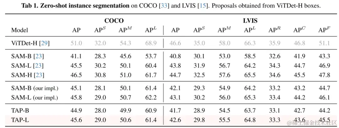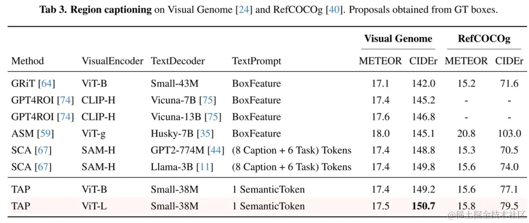 TAP 模型在零样本实例分割任务中取得了与 SAM 接近的分割精度(表1)。在零样本LVIS实例识别任务中,TAP 性能趋近于有监督检测模型的基线(表2)。基于 TAP 扩展的 38M 参数“小语言模型”在 Visual Genome 区域描述任务中取得了当前最优的 CIDEr 基准(表3),且参数量仅为此前最优方案 LLAMA-3B 的 1%。