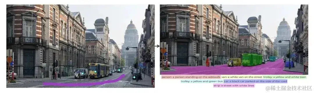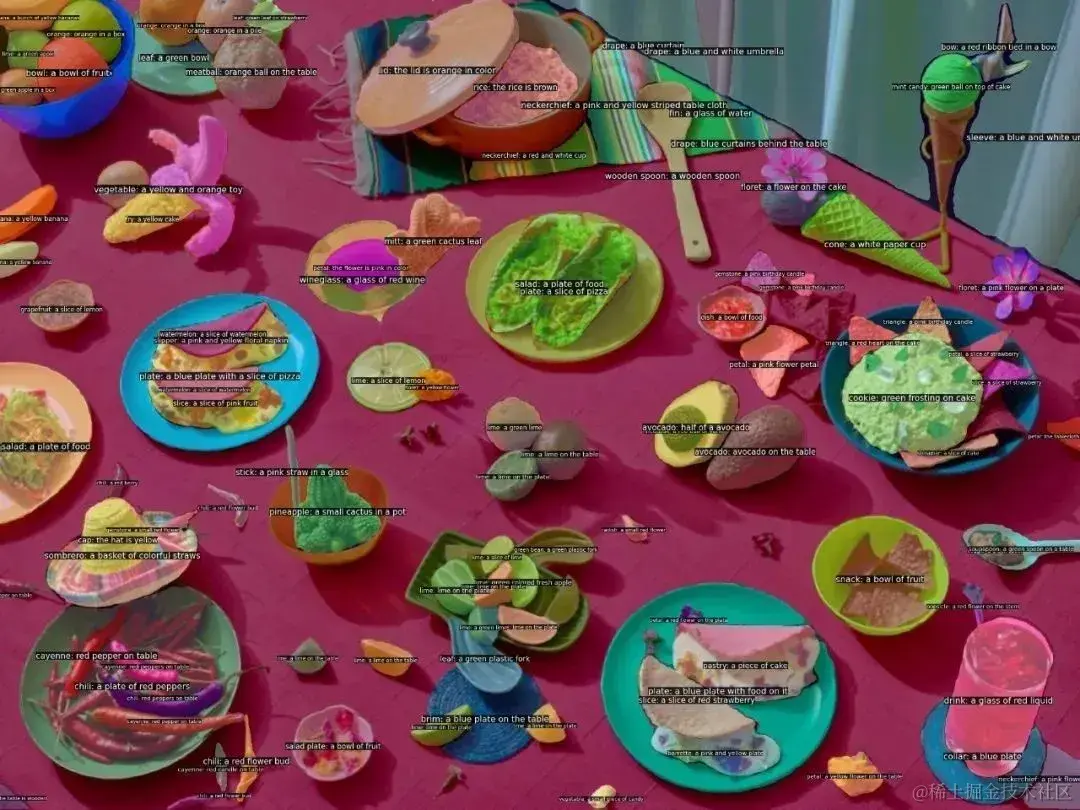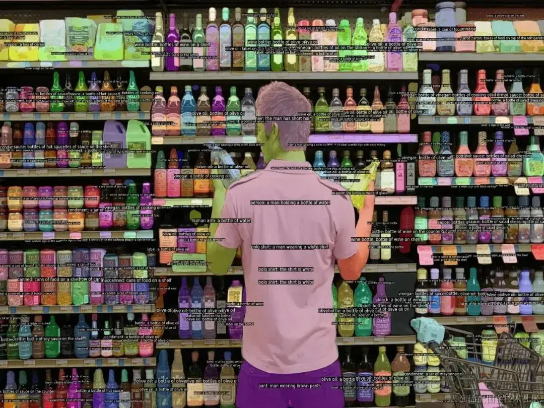 对于需要全景理解的场景,采用密集网格点作为提示,模型即可对场景内所有的目标进行分割、识别以及描述。