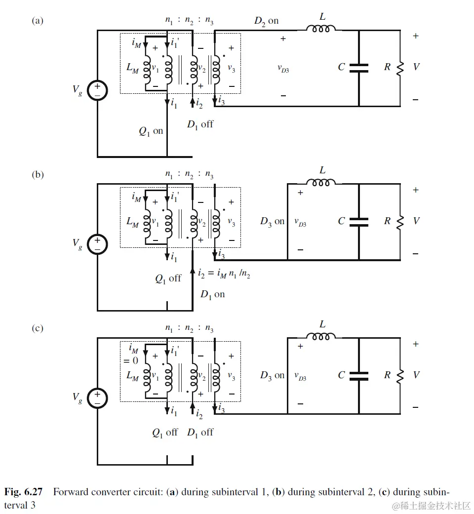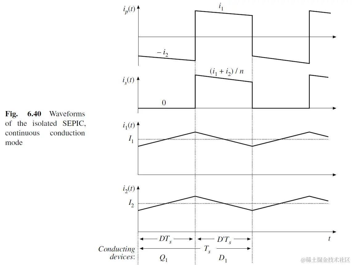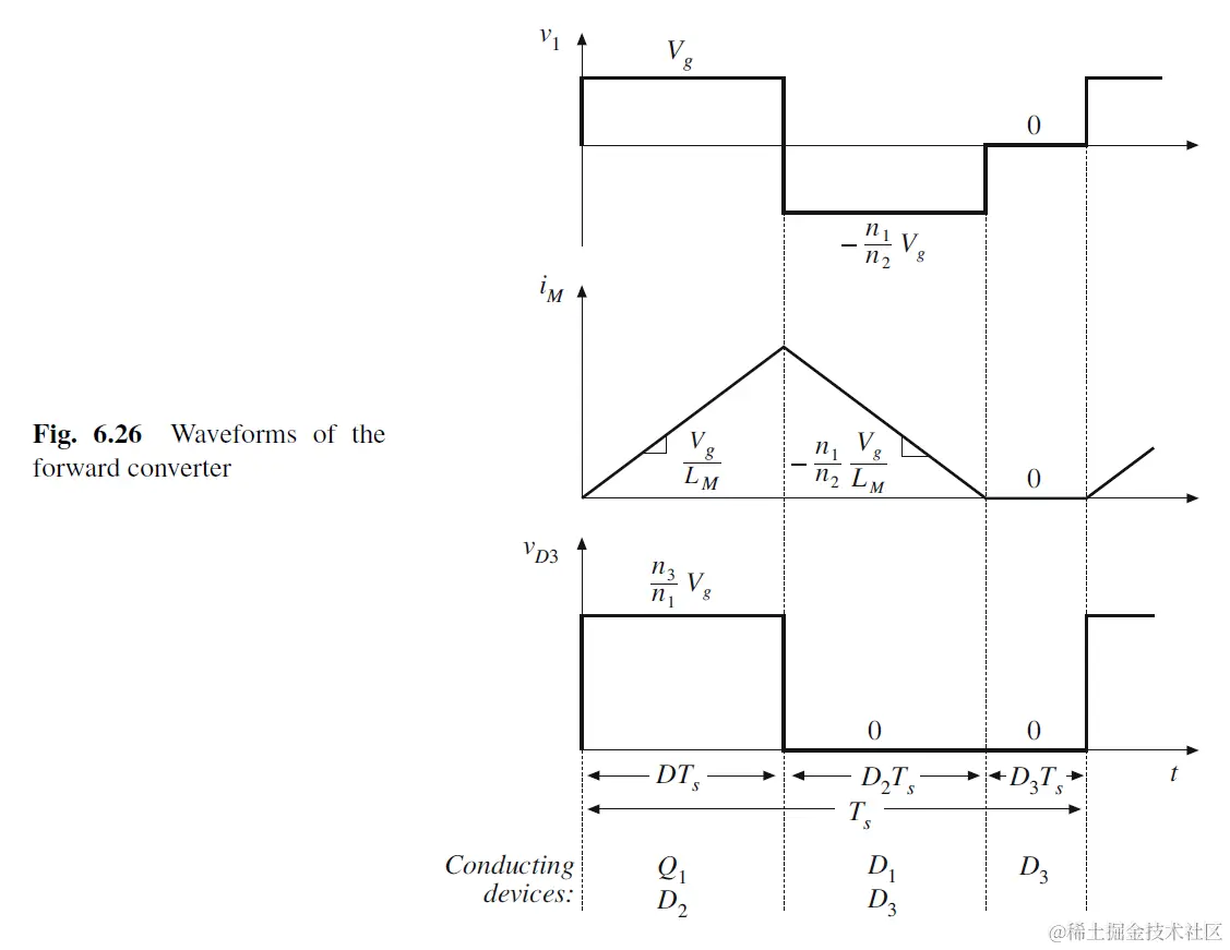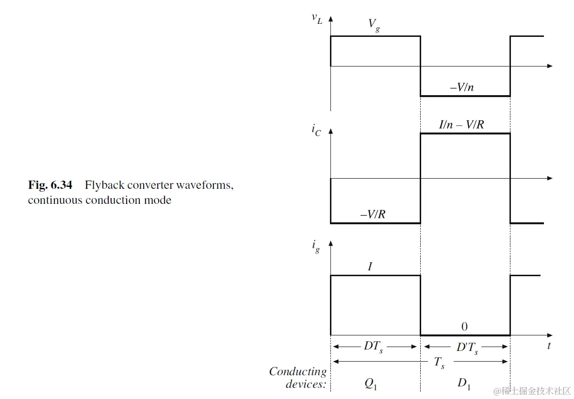 DTs<t<Ts, during subinterval 2, Q1 off, magnetizing inductor电流流出primary side, 因此流入secondary side, D1 on