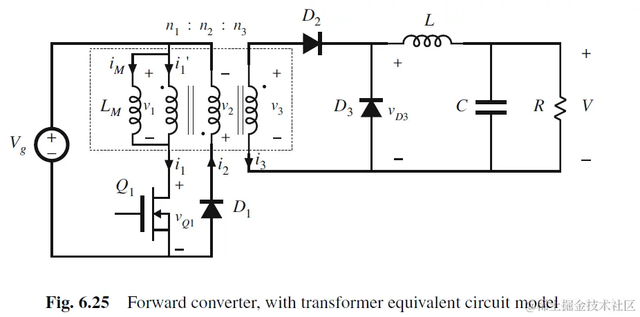 forward converter拓扑如下图所示. 其只需要一个switch, 因此适用于功率比全桥和半桥更小的应用. 当n1=n2, duty cycle limited 0<D<0.5.