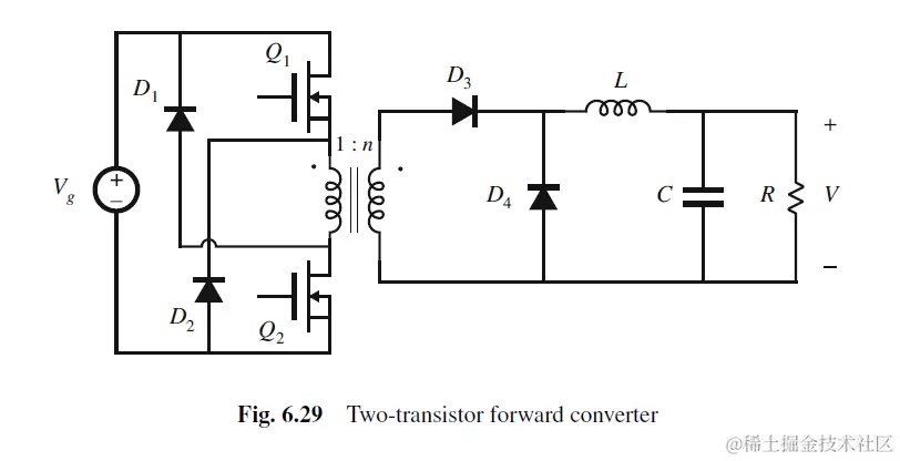 A two-transistor version of the forward converter如下图所示. Q1和Q2 gate signal一样, 同开同关.