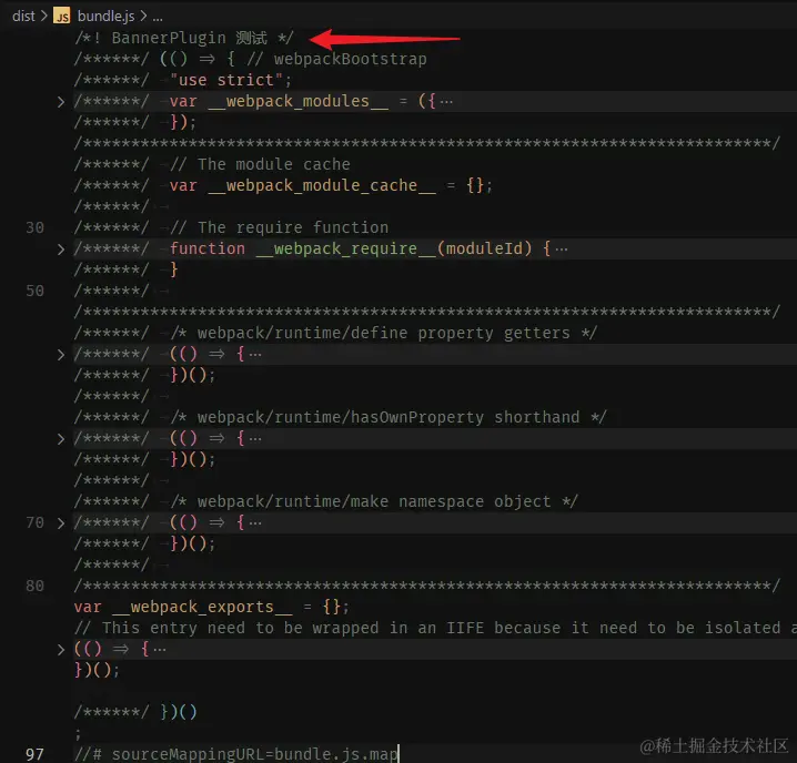最后,在打包生成的 bundle.js 的末尾,也成功的加上了 页脚测试 这个注释 ✅: