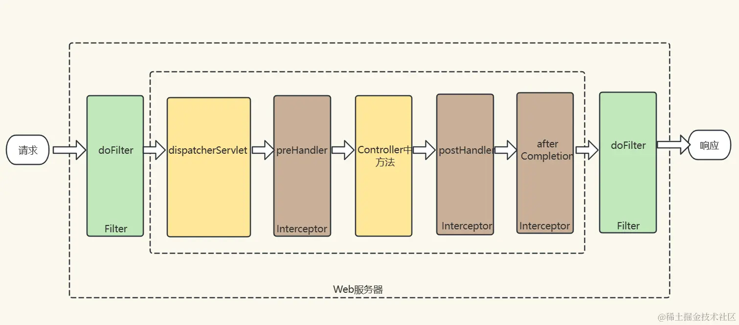 拦截器和过滤器同时存在时执行流程如下图所示: