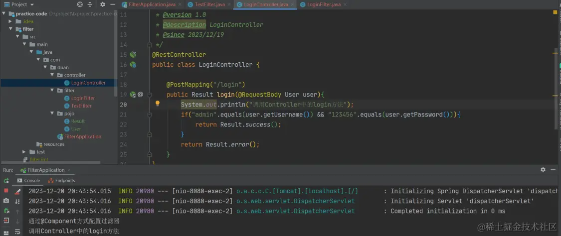 在 Filter 包新建 LoginFilter,在实现类上使用 @WebFilter 注解,在启动类上使用 @ServletComponentScan 注解设置扫描路径。