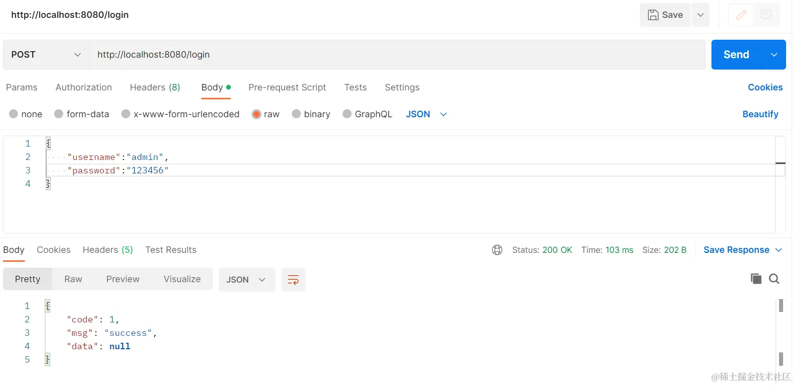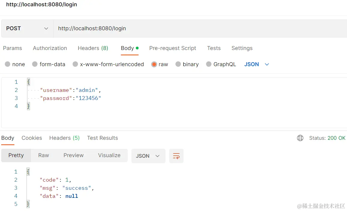 启动项目,通过 postman 访问 login 接口,查看结果。