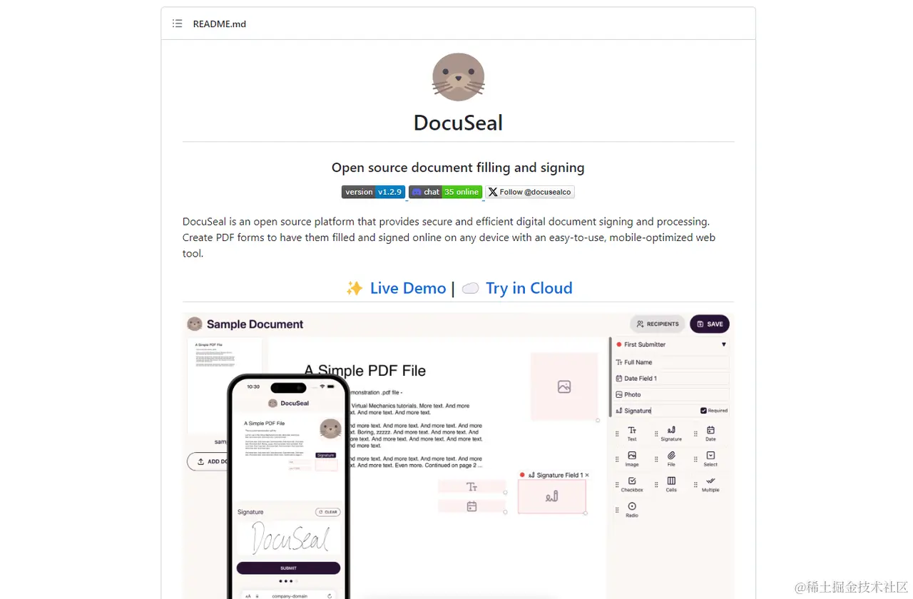 这是一款用 Ruby 写的在线签署文件平台,它开箱即用、容易上手、移动端友好,支持拖拽的方式创建 PDF 表单、在线填写和签名、自动发送邮件、用户管理等功能。