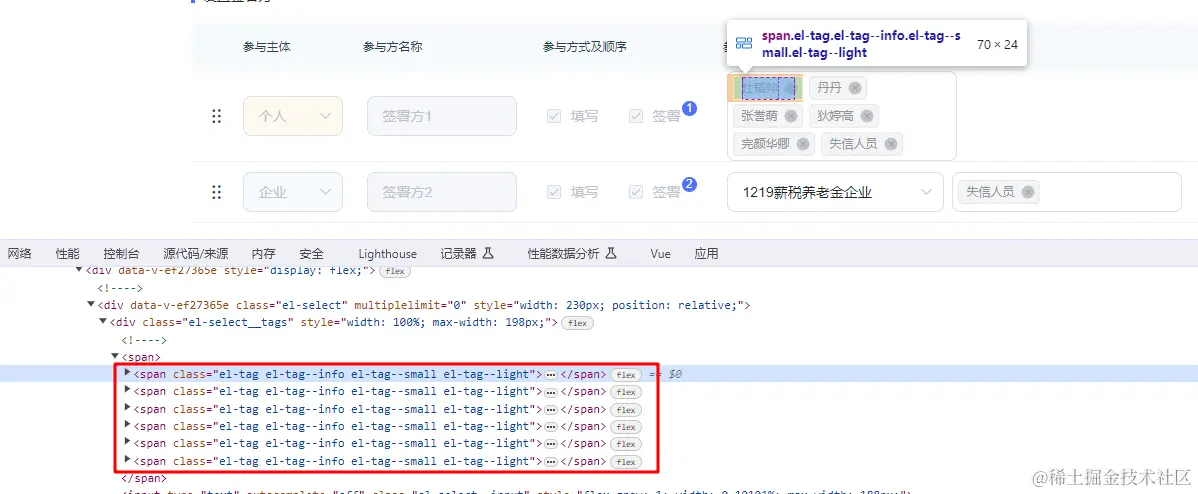 经过观察我们可知,页面上的人员姓名的dom元素的类名是el-tag el-tag--info。我们可以使用选择器让第二个的元素添加dispaly:none不展示到页面上。