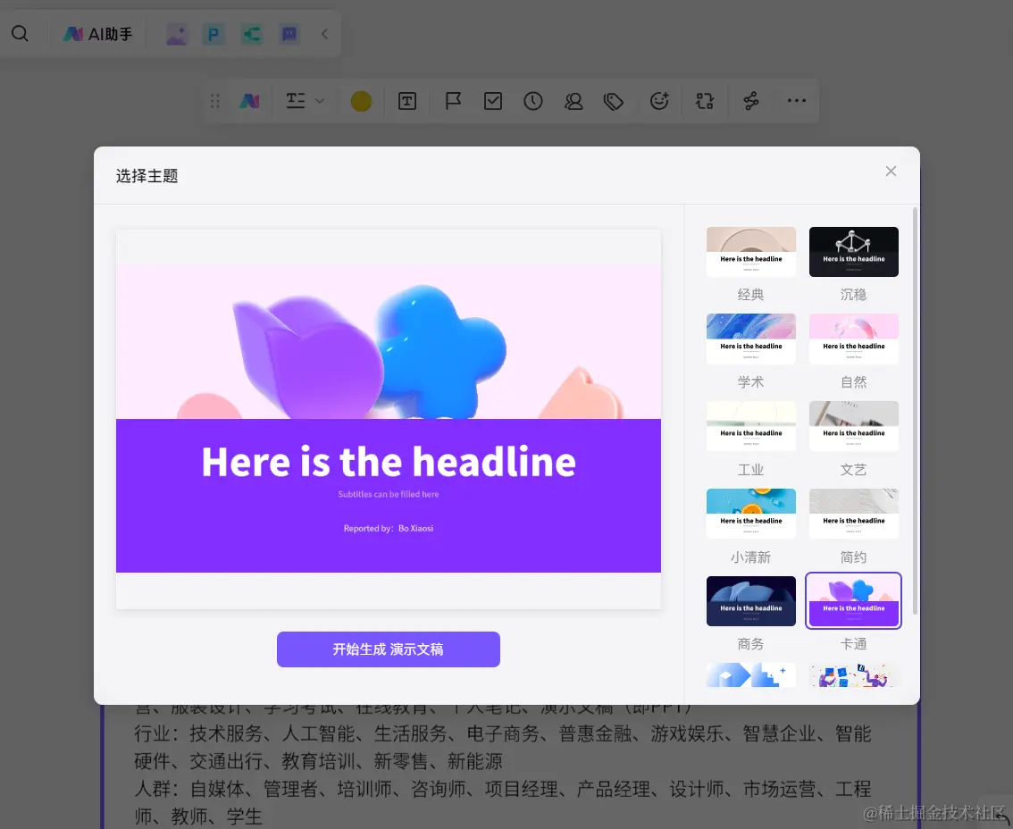 完成对PPT大纲的编辑后,点击底部的「开始生成演示文稿」,在弹出的窗口选择一种PPT主题(风格),AI就会基于大纲自动生成一份完整的PPT。