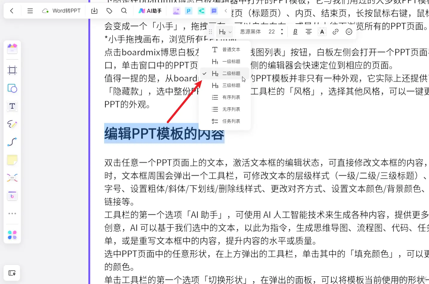 因此,将Word文档内容粘贴到boardmix文档后,我们要给文档中的标题内容设置「一级标题」样式: